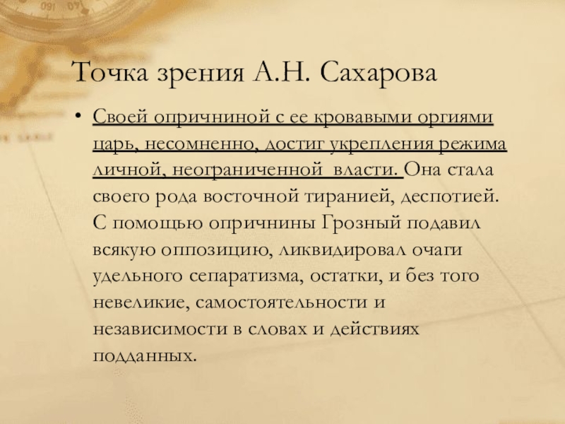 достиг укрепления режима личной, неограниченной власти. Она стала своего рода восточной тиранией, деспотией. С помощью опричнины Грозный подавил всякую оппозицию, ликвидировал очаги удельного сепаратизма, остатки, и без того невеликие, самостоятельности и независимости в словах и действиях подданных.