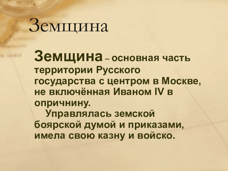 Земщина – основная часть территории Русского государства с центром в Москве,