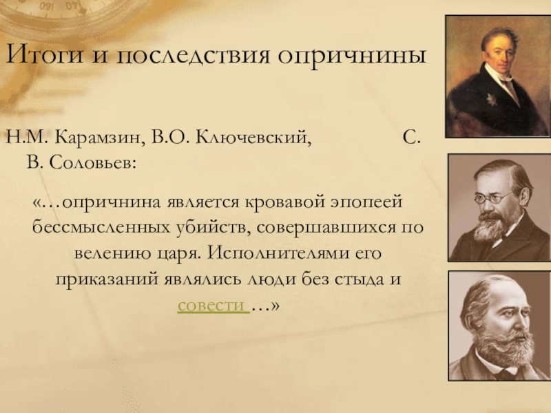 «…опричнина является кровавой эпопеей бессмысленных убийств, совершавшихся по велению царя. Исполнителями его приказаний являлись люди без стыда и совести …»