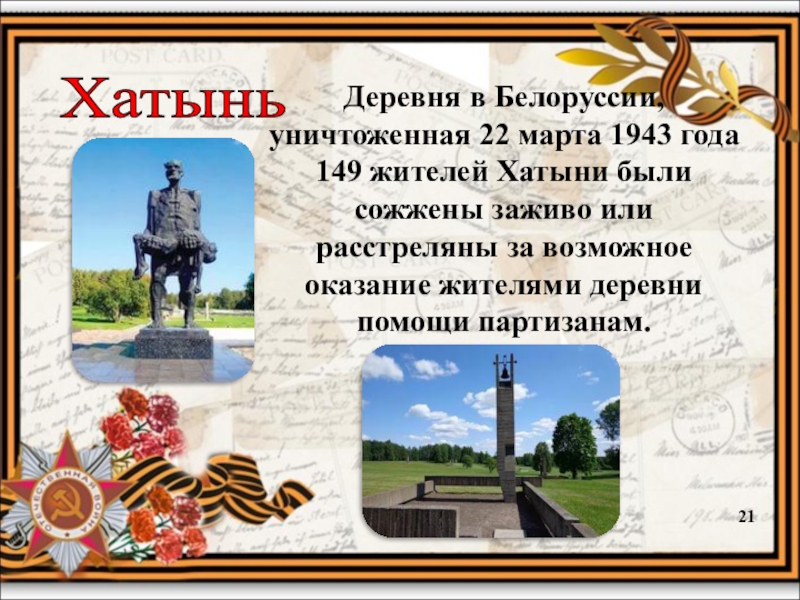 Хатынь Деревня в Белоруссии, уничтоженная 22 марта 1943 года 149 жителей Хатыни были сожжены заживо или расстреляны