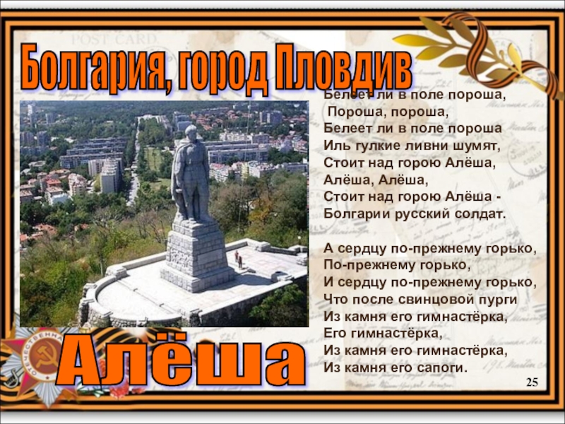 Болгария, город Пловдив Алёша Белеет ли в поле пороша, Пороша, пороша,Белеет ли в поле порошаИль гулкие ливни
