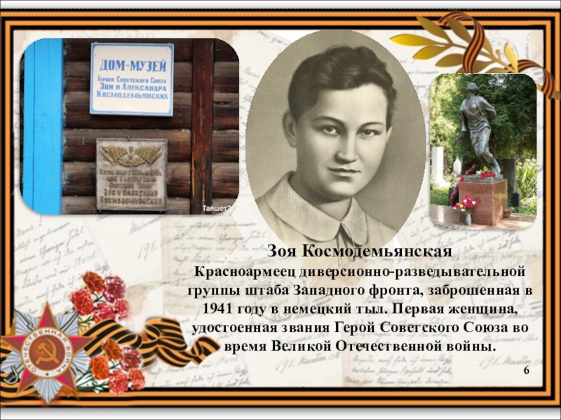 Зоя КосмодемьянскаяКрасноармеец диверсионно-разведывательной группы штаба Западного фронта, заброшенная в 1941 году в немецкий тыл. Первая женщина, удостоенная