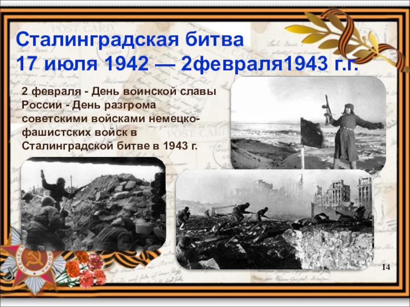 Слайд 14Сталинградская битва 17 июля 1942 — 2февраля1943 г.г.
