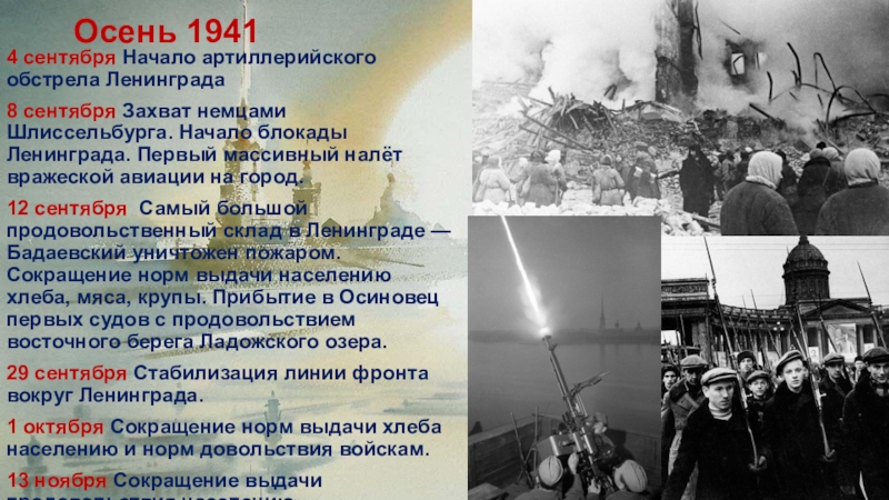 12 сентября Самый большой продовольственный склад в Ленинграде — Бадаевский уничтожен пожаром. Сокращение норм выдачи населению хлеба, мяса, крупы. Прибытие в Осиновец первых судов с продовольствием восточного берега Ладожского озера.