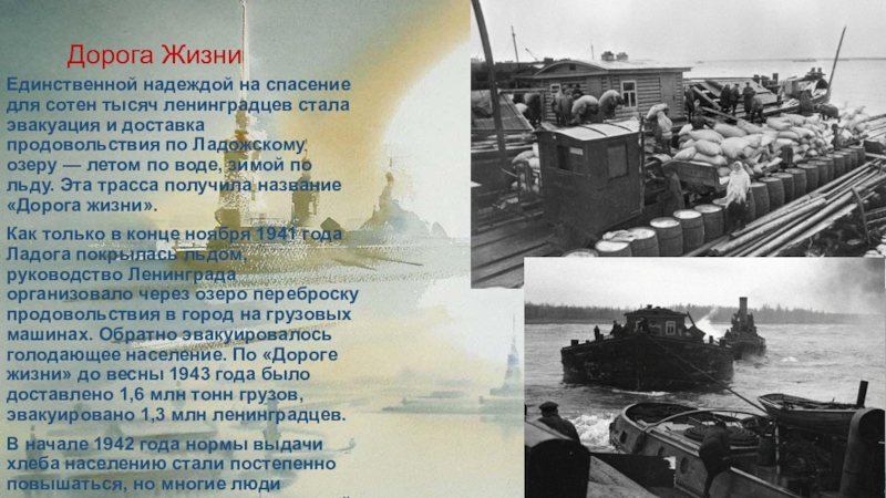 Как только в конце ноября 1941 года Ладога покрылась льдом, руководство Ленинграда организовало через озеро переброску продовольствия в город на грузовых машинах. Обратно эвакуировалось голодающее население. По «Дороге жизни» до весны 1943 года было доставлено 1,6 млн тонн грузов, эвакуировано 1,3 млн ленинградцев.