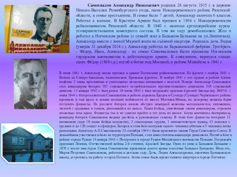 В июле 1941 г. Александр вновь призван в армию Ногинским райвоенкоматом. На фронте с ноября 1941 г. Воевал на Северо-Западном, Калининском, Брянском фронтах. В ноябре 1941 г. его орудие в районе Клина подбило 2 танка противника и уничтожило несколько автомашин с пехотой. Вскоре Александр Самохвалов стал командиром батареи 207 стрелкового истребительного противотанкового дивизиона 348 стрелковой дивизии. 15 января 1942 г. был ранен. 19 июля 1943 г. был награждён орденом Красной Звезды (пр. №074). 1 июля 1944 г. батарея капитана Самохвалова в районе деревень Бродок и Сухище (Сунище) Червенского района проникла в тыл врага и заняла позиции поблизости от шоссе Могилев-Минск, по которому должны были отступать фашисты. На рассвете батарея начала обстрел немецкой колонны мотоциклистов, автомашин, тягачей с орудиями и танков, двигавшейся по шоссе. Наши бойцы, увлечённые своим командиром, отразили несколько атак врага. Фашисты так и не сумели пройти в тот день по шоссе. Когда кончились боеприпасы, командир батареи Самохвалов поднял расчёты в рукопашную схватку. В этом бою фашисты потеряли 13 автомашин (еще 19 наши бойцы подожгли), 2 самоходных орудия, 1 автоматическую пушку, 43 повозки с грузами и до 120 солдат и офицеров. Батарея в этом бою потеряла одного человека убитым и 3 человека легко раненными. Капитану А.Н.Самохвалову 25 сентября 1944 г. было присвоено звание Героя Советского Союза. В дальнейшем участвовал в боях на территории Польши, стал заместителем командира дивизиона. Погиб в бою в районе города Ружан 18 января 1945 г. Похоронен в городе Ружан Мазовецкого воеводства Польши. Награждён орденами Ленина, Отечественной войны 2-й степени, Красной Звезды. Одна из улиц в Большом Бунькове с 1970 г. носит имя героя. Семья Самохвалова проживала долгое время в посёлке Большое Буньково. Жена его, Мария Петровна Самохвалова, работала в детском саду. Дочь, Лидия Александровна, окончила Буньковскую школу, устроилась на работу в город Ногинск. Затем семье была предоставлена квартира в городе Ногинске.