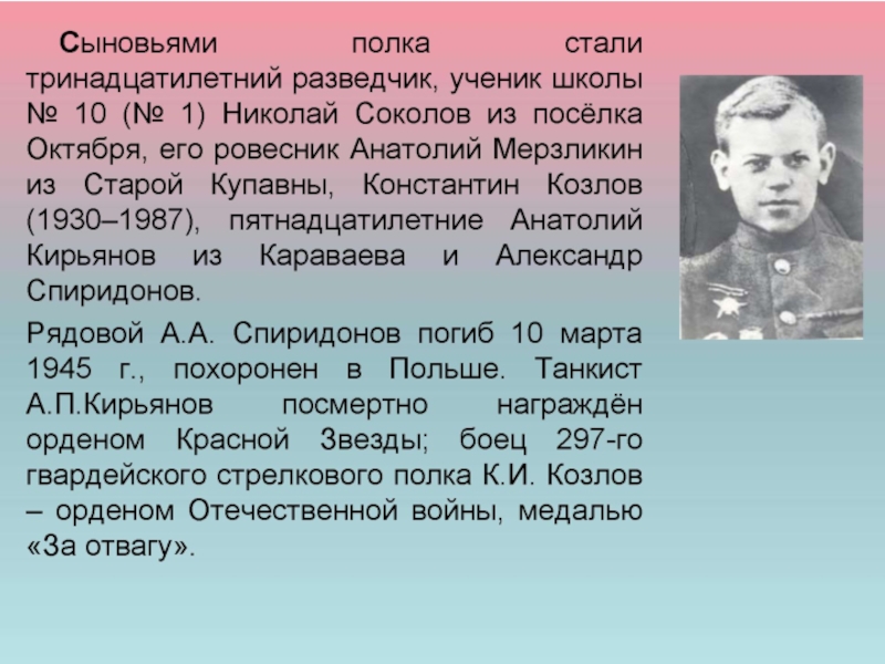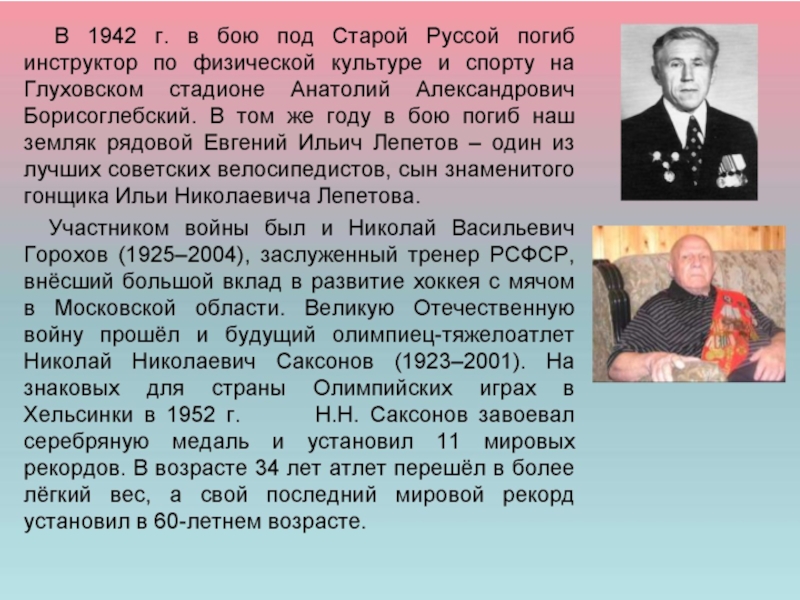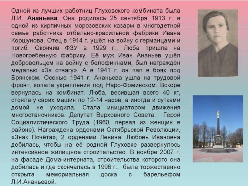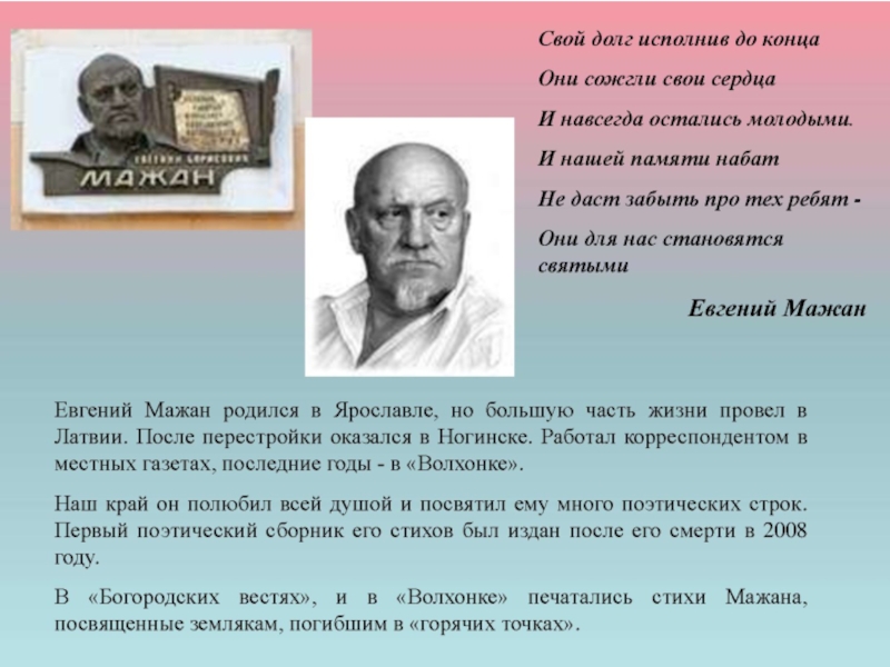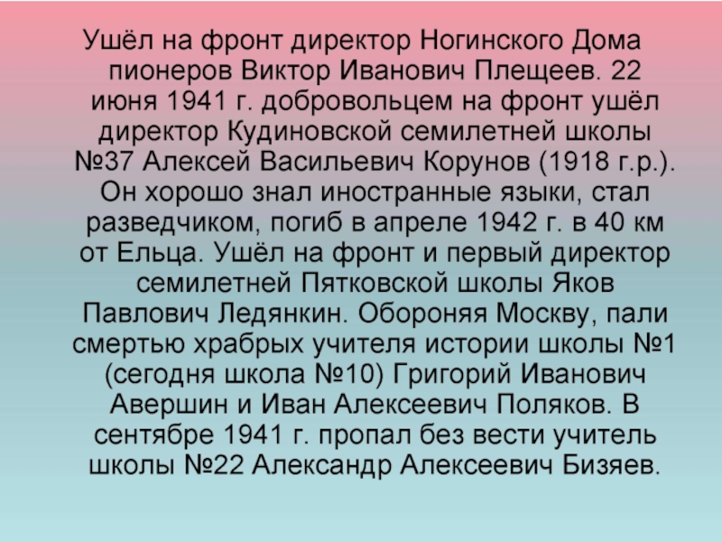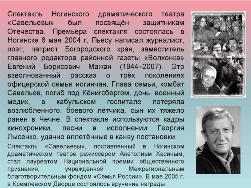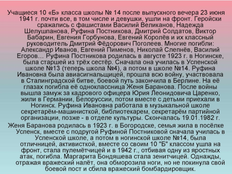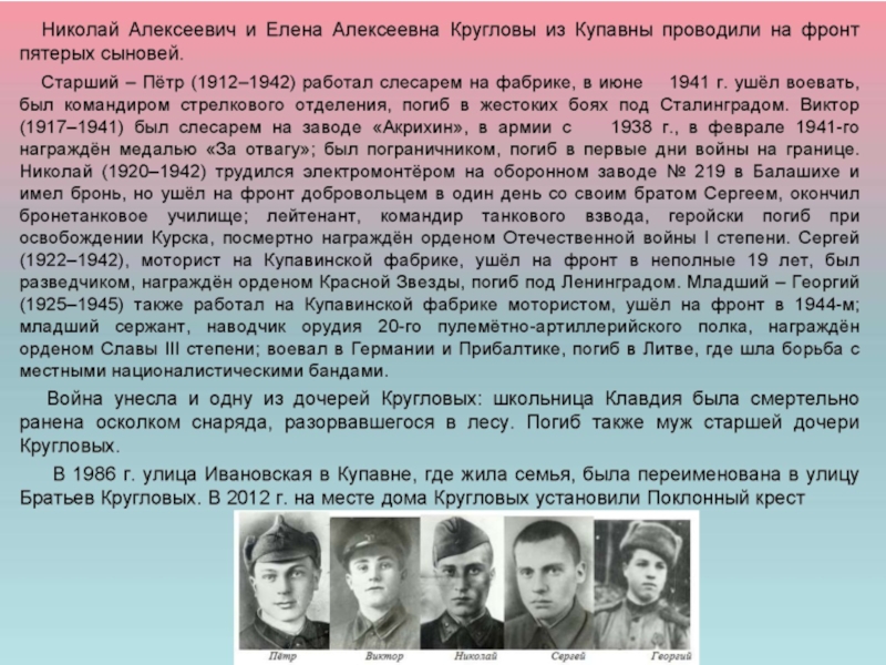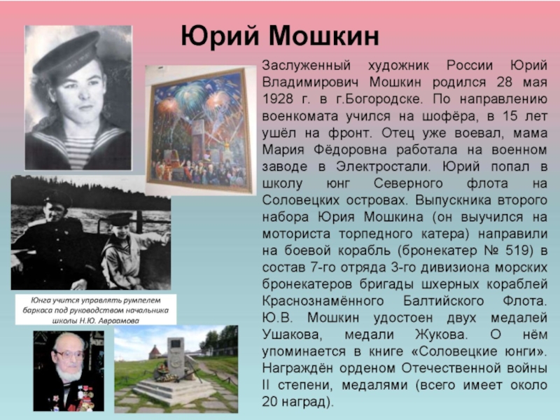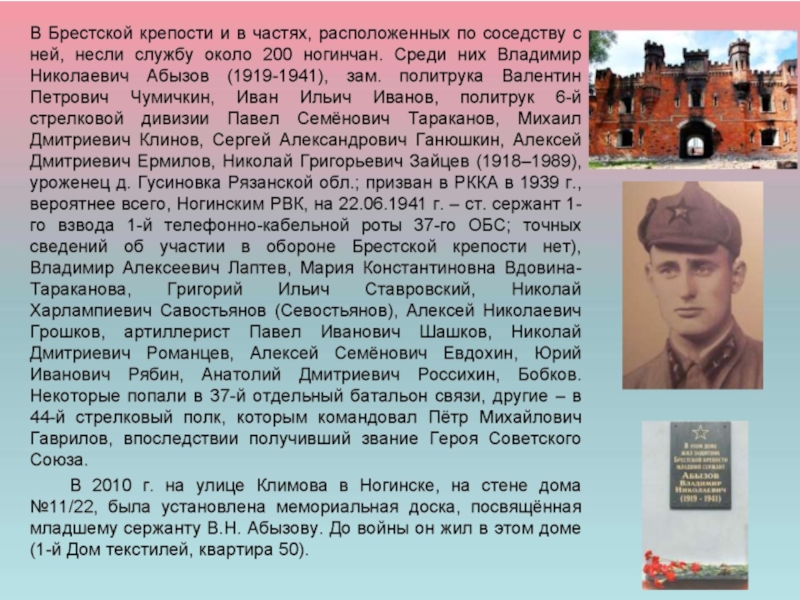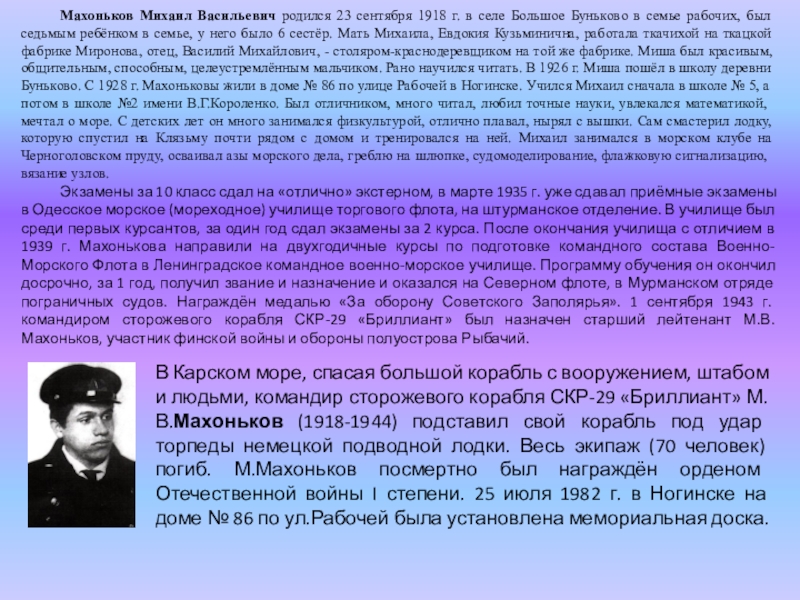 В Карском море, спасая большой корабль с вооружением, штабом и людьми, командир сторожевого корабля СКР-29 «Бриллиант» М.В.Махоньков (1918-1944) подставил свой корабль под удар торпеды немецкой подводной лодки. Весь экипаж (70 человек) погиб. М.Махоньков посмертно был награждён орденом Отечественной войны I степени. 25 июля 1982 г. в Ногинске на доме № 86 по ул.Рабочей была установлена мемориальная доска.
