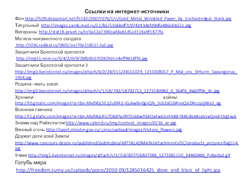 Ссылки на интернет-источникиФон http://fc09.deviantart.net/fs14/i/2007/076/1/c/Gold_Metal_Wrinkled_Paper_by_Enchantedgal_Stock.jpgТитульный http://images.cards.mail.ru/51/b5/5166bdf7c974243defd9dfa486ebb551.jpg Ветераны http://stat18.privet.ru/lr/0a12a7390cad4ab1d5a3118a9f1877faМогила неизвестного солдата http://i036.radikal.ru/0805/ee/70e1585153a2.jpgЗащитники Брестской крепости http://img15.nnm.ru/3/4/2/d/9/2bfb950702829e1e4eff9618ff6.jpgЗащитники Брестской крепости 2http://img0.liveinternet.ru/images/attach/b/2/24/555/24555029_1210308057_P_Mal_cev_SHturm_Sapungoruy_1958.jpgРодина –мать