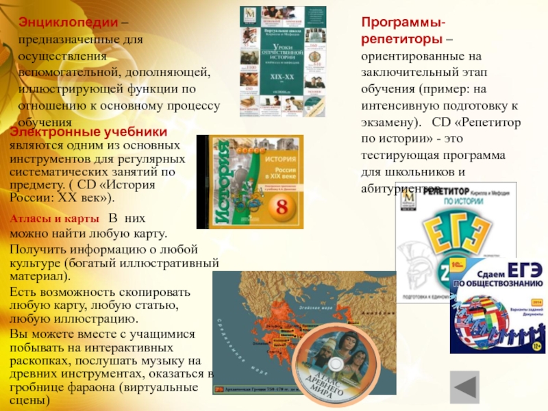 Программы-репетиторы – ориентированные на заключительный этап обучения (пример: на интенсивную подготовку к экзамену). CD «Репетитор по истории» - это тестирующая программа для школьников и абитуриентов