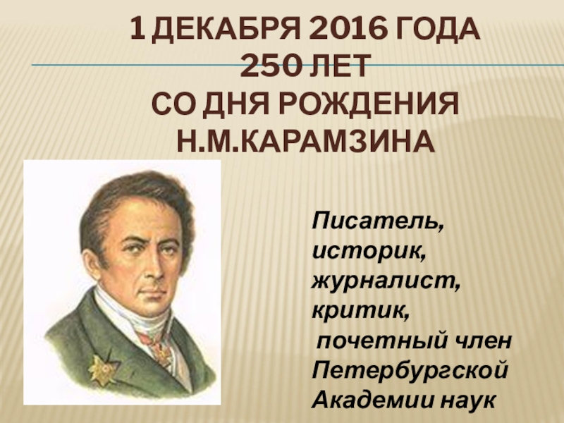 1 ДЕКАБРЯ 2016 ГОДА 250 ЛЕТ СО ДНЯ РОЖДЕНИЯ Н.М.КАРАМЗИНАПисатель, историк, журналист, критик, почетный член Петербургской Академии наук