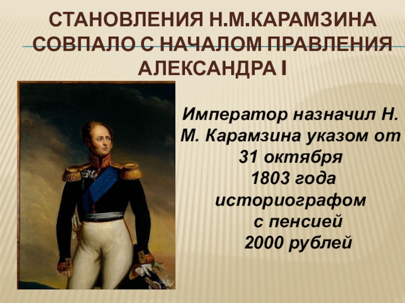 СТАНОВЛЕНИЯ Н.М.КАРАМЗИНА  СОВПАЛО С НАЧАЛОМ ПРАВЛЕНИЯ АЛЕКСАНДРА IИмператор назначил Н.М. Карамзина указом от 31 октября 1803