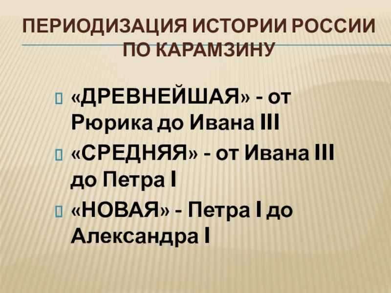 ПЕРИОДИЗАЦИЯ ИСТОРИИ РОССИИ  ПО КАРАМЗИНУ«ДРЕВНЕЙШАЯ» - от Рюрика до Ивана III«СРЕДНЯЯ» - от Ивана III до
