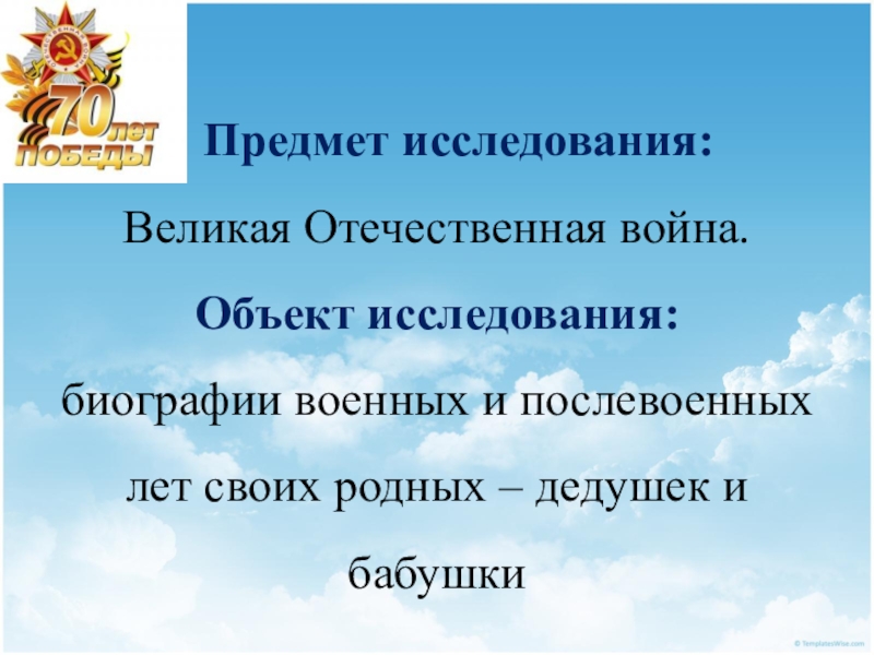 Предмет исследования:  Великая Отечественная война. Объект исследования:  биографии военных и послевоенных лет своих родных –