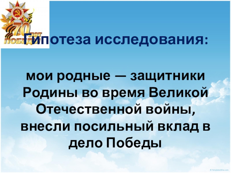 Слайд 5Гипотеза исследования: мои родные — защитники Родины во время Великой Отечественной