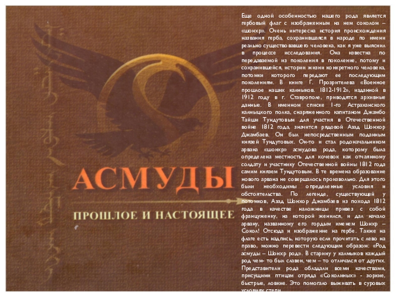 нем соколом – «шонхр». Очень интересна история происхождения названия герба, сохранившаяся в народе по имени реально существовавшего человека, как я уже выяснил в процессе исследования. Она известна по передаваемой из поколения в поколение, потому и сохранившейся, истории жизни конкретного человека, потомки которого передают ее последующим поколениям. В книге Г. Прозрителева «Военное прошлое наших калмыков. 1812-1912», изданной в 1912 году в г. Ставрополе, приводятся архивные данные. В именном списке 1-го Астраханского калмыцкого полка, снаряженного капитаном Джамбо Тайши Тундутовым для участия в Отечественной войне 1812 года, значится рядовой Азад Шонхор Джамбаев. Он был непосредственным поданным князей Тундутовых. Он-то и стал родоначальником арвана «шонхр» асмудова рода, которому была определена местность для кочевок как отчаянному солдату и участнику Отечественной войны 1812 года самим князем Тундутовым. В те времена образование нового арвана не совершалось произвольно. Для этого были необходимы определенные условия и обстоятельства. По легенде, существующей у потомков, Азад Шонхор Джамбаев из похода 1812 года в качестве наложницы привез с собой француженку, на которой женился, и дал начало арвану, названному его гордым именем Шонхр – Сокол! Отсюда и изображение на гербе. Также на флаге есть надпись, которую если прочитать с лево на право, можно перевести следующим образом: «Род асмуды – Шонхр род». В старину у калмыков каждый род чем- то был славен, чем – то отличался от других. Представители рода обладали всеми качествами, присущими птицам отряда «Соколиных» - зоркие, быстрые, ловкие. Это помогало выживать в суровых условиях степи.
