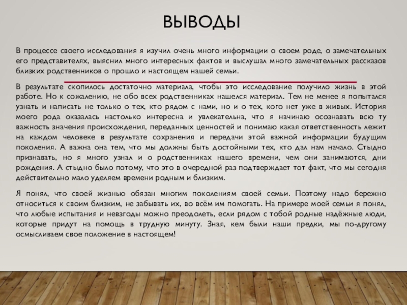 Я понял, что своей жизнью обязан многим поколениям своей семьи. Поэтому надо бережно относиться к своим близким, не забывать их, во всём им помогать. На примере моей семьи я понял, что любые испытания и невзгоды можно преодолеть, если рядом с тобой родные надёжные люди, которые придут на помощь в трудную минуту. Зная, кем были наши предки, мы по-другому осмысливаем свое положение в настоящем!