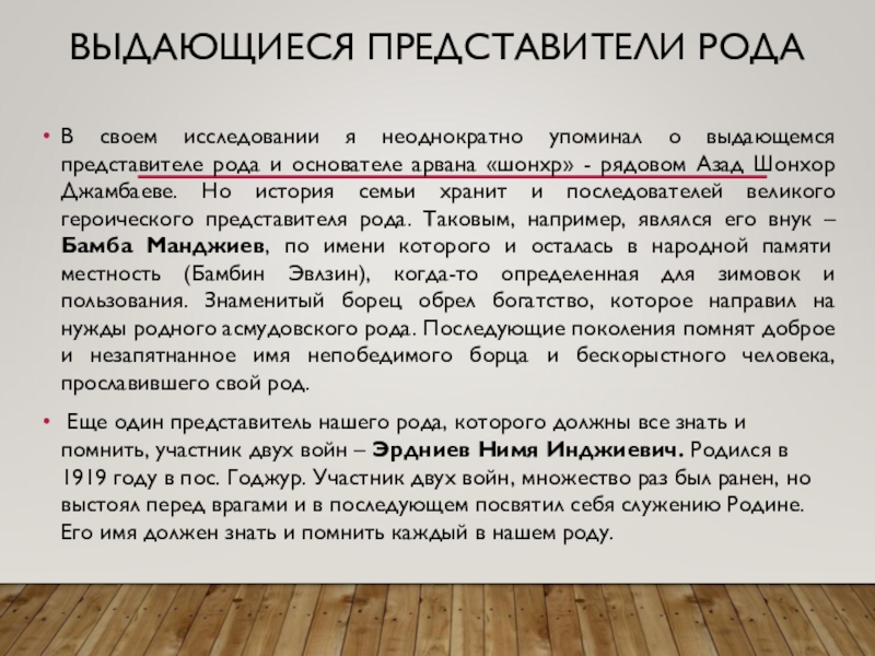 рода и основателе арвана «шонхр» - рядовом Азад Шонхор Джамбаеве. Но история семьи хранит и последователей великого героического представителя рода. Таковым, например, являлся его внук – Бамба Манджиев, по имени которого и осталась в народной памяти местность (Бамбин Эвлзин), когда-то определенная для зимовок и пользования. Знаменитый борец обрел богатство, которое направил на нужды родного асмудовского рода. Последующие поколения помнят доброе и незапятнанное имя непобедимого борца и бескорыстного человека, прославившего свой род.