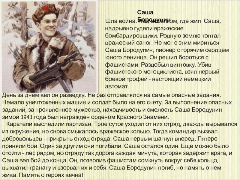 Шла война. Над поселком, где жил Саша, надрывно гудели вражеские бомбардировщики. Родную землю топтал вражеский сапог. Не мог с этим мириться Саша Бородулин, пионер с горячим сердцем юного ленинца. Он решил бороться с фашистами. Раздобыл винтовку. Убив фашистского мотоциклиста, взял первый боевой трофей - настоящий немецкий автомат.