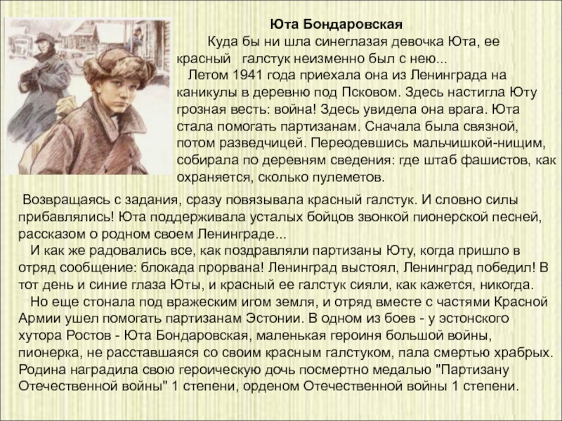 Летом 1941 года приехала она из Ленинграда на каникулы в деревню под Псковом. Здесь настигла Юту грозная весть: война! Здесь увидела она врага. Юта стала помогать партизанам. Сначала была связной, потом разведчицей. Переодевшись мальчишкой-нищим, собирала по деревням сведения: где штаб фашистов, как охраняется, сколько пулеметов.