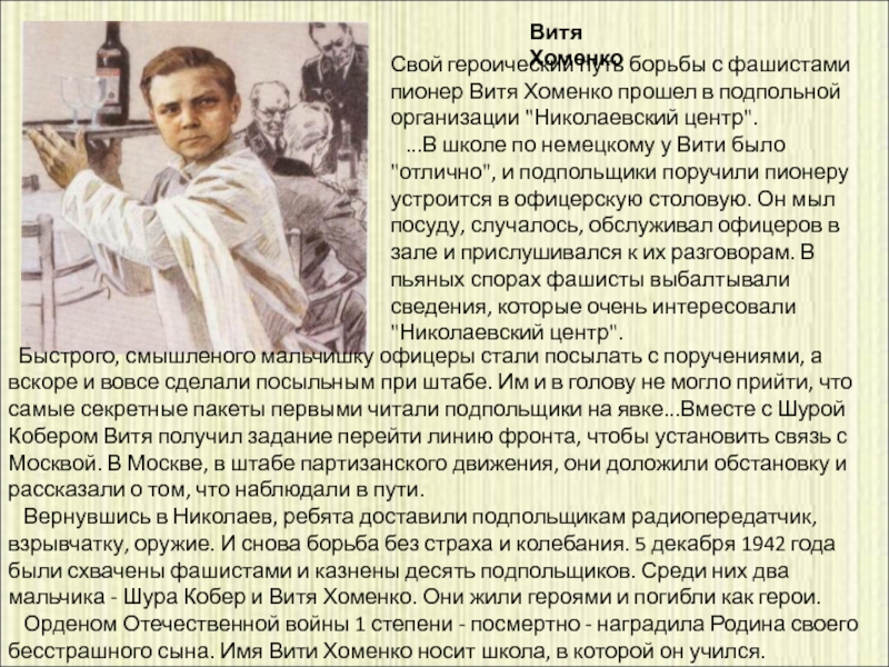 ...В школе по немецкому у Вити было "отлично", и подпольщики поручили пионеру устроится в офицерскую столовую. Он мыл посуду, случалось, обслуживал офицеров в зале и прислушивался к их разговорам. В пьяных спорах фашисты выбалтывали сведения, которые очень интересовали "Николаевский центр".