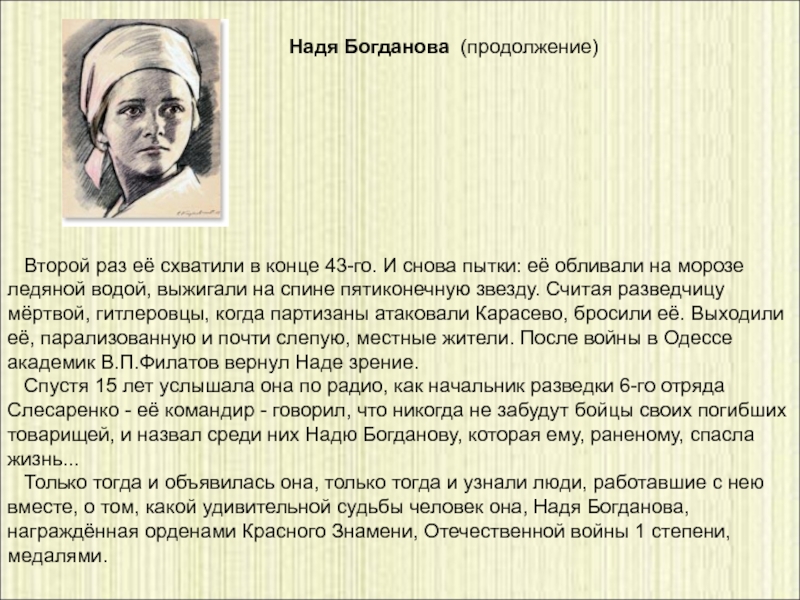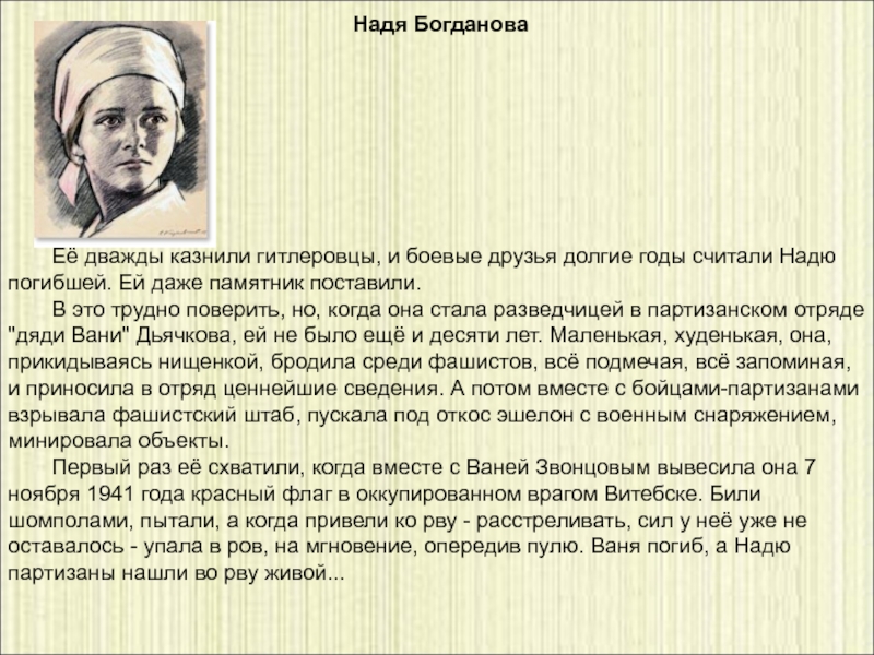 В это трудно поверить, но, когда она стала разведчицей в партизанском отряде "дяди Вани" Дьячкова, ей не было ещё и десяти лет. Маленькая, худенькая, она, прикидываясь нищенкой, бродила среди фашистов, всё подмечая, всё запоминая, и приносила в отряд ценнейшие сведения. А потом вместе с бойцами-партизанами взрывала фашистский штаб, пускала под откос эшелон с военным снаряжением, минировала объекты. Первый раз её схватили, когда вместе с Ваней Звонцовым вывесила она 7 ноября 1941 года красный флаг в оккупированном врагом Витебске. Били шомполами, пытали, а когда привели ко рву - расстреливать, сил у неё уже не оставалось - упала в ров, на мгновение, опередив пулю. Ваня погиб, а Надю партизаны нашли во рву живой...