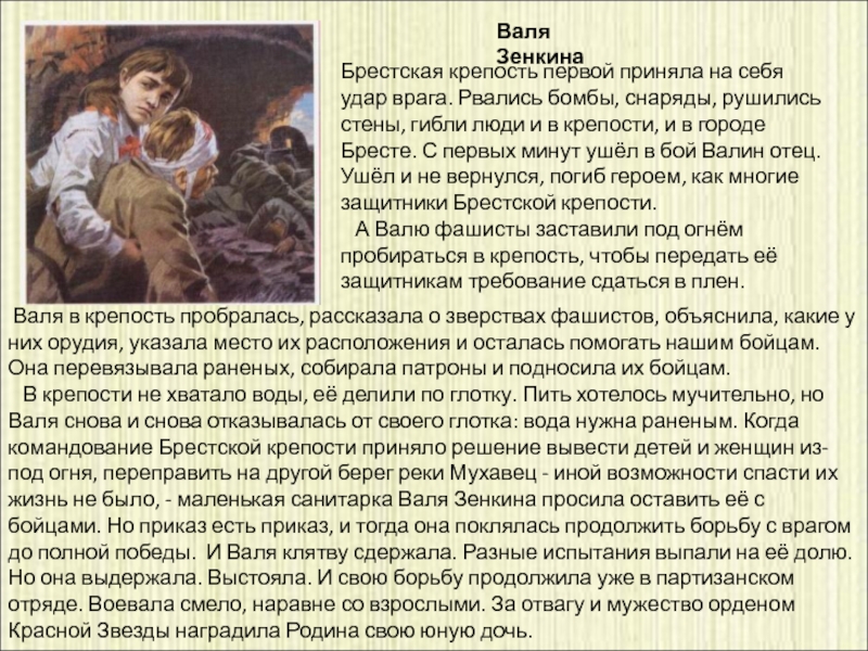 Брестская крепость первой приняла на себя удар врага. Рвались бомбы, снаряды, рушились стены, гибли люди и в крепости, и в городе Бресте. С первых минут ушёл в бой Валин отец. Ушёл и не вернулся, погиб героем, как многие защитники Брестской крепости.
