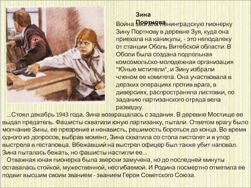 Война застала ленинградскую пионерку Зину Портнову в деревне Зуя, куда она приехала на каникулы, - это неподалеку от станции Оболь Витебской области. В Оболи была создана подпольная комсомольско-молодежная организация "Юные мстители", и Зину избрали членом ее комитета. Она участвовала в дерзких операциях против врага, в диверсиях, распространяла листовки, по заданию партизанского отряда вела разведку.