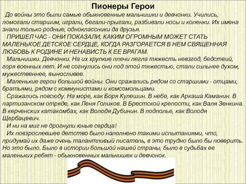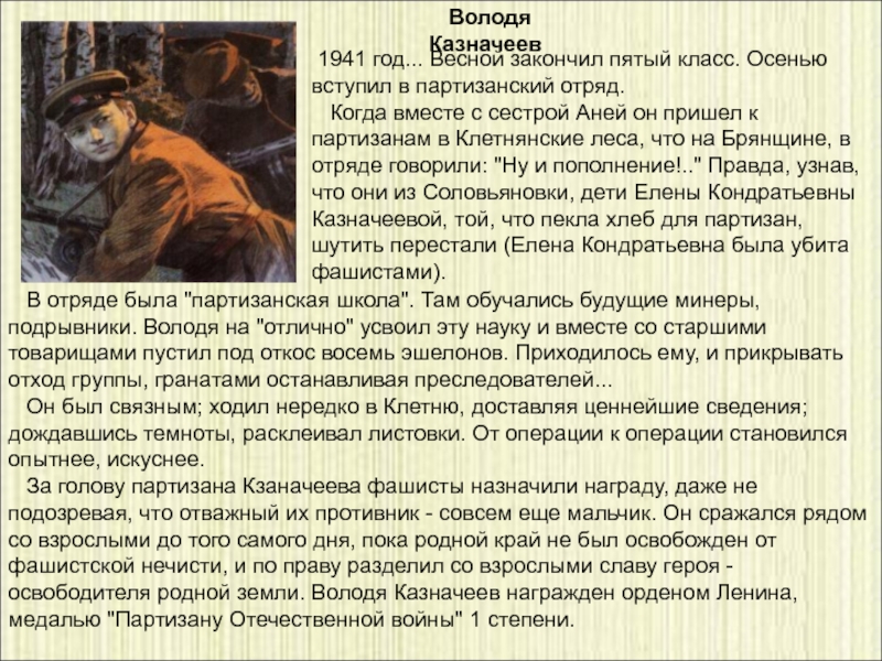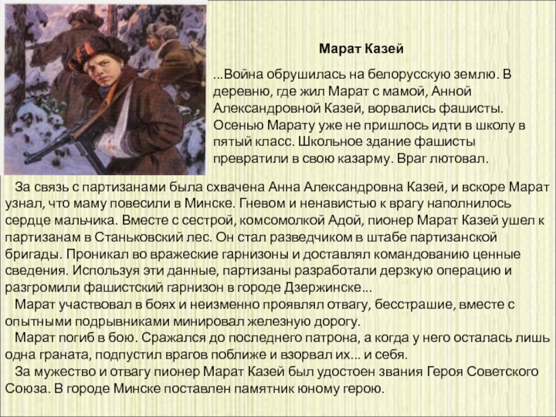 ...Война обрушилась на белорусскую землю. В деревню, где жил Марат с мамой, Анной Александровной Казей, ворвались фашисты. Осенью Марату уже не пришлось идти в школу в пятый класс. Школьное здание фашисты превратили в свою казарму. Враг лютовал.
