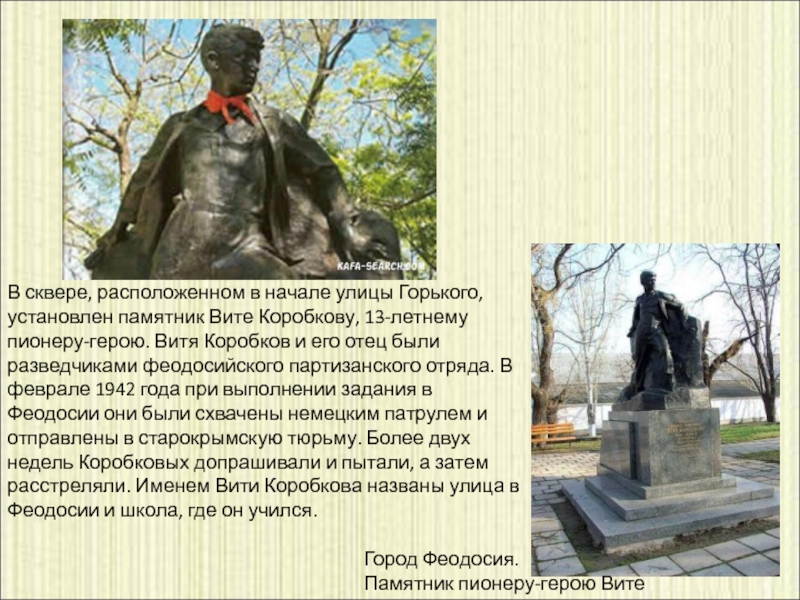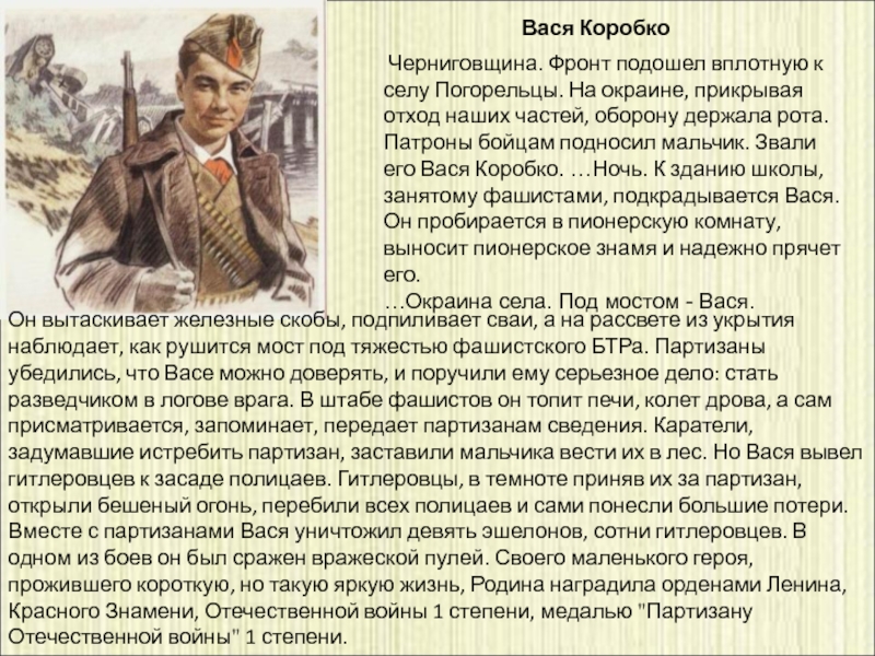 Черниговщина. Фронт подошел вплотную к селу Погорельцы. На окраине, прикрывая отход наших частей, оборону держала рота. Патроны бойцам подносил мальчик. Звали его Вася Коробко. …Ночь. К зданию школы, занятому фашистами, подкрадывается Вася. Он пробирается в пионерскую комнату, выносит пионерское знамя и надежно прячет его.