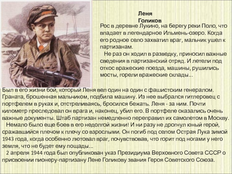 1941 год... Весной закончил пятый класс. Осенью вступил в партизанский отряд.