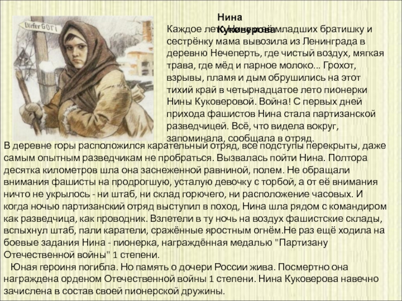 Каждое лето Нину и её младших братишку и сестрёнку мама вывозила из Ленинграда в деревню Нечеперть, где чистый воздух, мягкая трава, где мёд и парное молоко... Грохот, взрывы, пламя и дым обрушились на этот тихий край в четырнадцатое лето пионерки Нины Куковеровой. Война! С первых дней прихода фашистов Нина стала партизанской разведчицей. Всё, что видела вокруг, запоминала, сообщала в отряд.