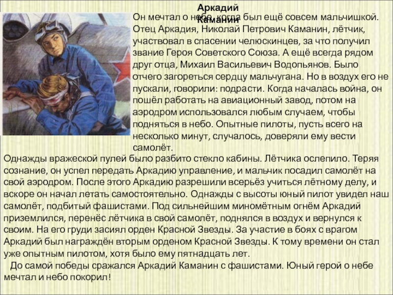 Он мечтал о небе, когда был ещё совсем мальчишкой. Отец Аркадия, Николай Петрович Каманин, лётчик, участвовал в спасении челюскинцев, за что получил звание Героя Советского Союза. А ещё всегда рядом друг отца, Михаил Васильевич Водопьянов. Было отчего загореться сердцу мальчугана. Но в воздух его не пускали, говорили: подрасти. Когда началась война, он пошёл работать на авиационный завод, потом на аэродром использовался любым случаем, чтобы подняться в небо. Опытные пилоты, пусть всего на несколько минут, случалось, доверяли ему вести самолёт.
