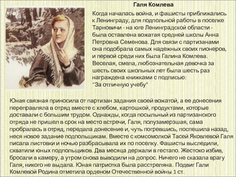 Когда началась война, и фашисты приближались к Ленинграду, для подпольной работы в поселке Тарновичи - на юге Ленинградской области - была оставлена вожатая средней школы Анна Петровна Семенова. Для связи с партизанами она подобрала самых надежных своих пионеров, и первой среди них была Галина Комлева. Веселая, смела, любознательная девочка за шесть своих школьных лет была шесть раз награждена книжками с подписью:
