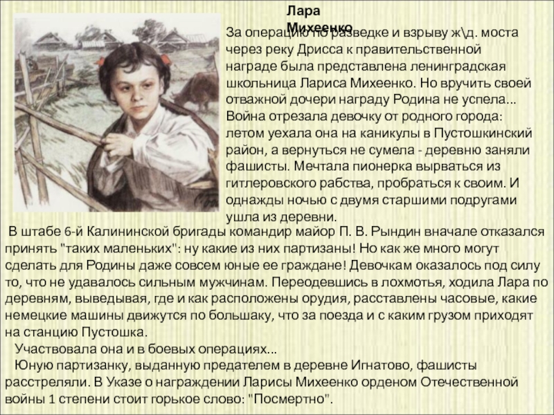 За операцию по разведке и взрыву ж\д. моста через реку Дрисса к правительственной награде была представлена ленинградская школьница Лариса Михеенко. Но вручить своей отважной дочери награду Родина не успела... Война отрезала девочку от родного города: летом уехала она на каникулы в Пустошкинский район, а вернуться не сумела - деревню заняли фашисты. Мечтала пионерка вырваться из гитлеровского рабства, пробраться к своим. И однажды ночью с двумя старшими подругами ушла из деревни.