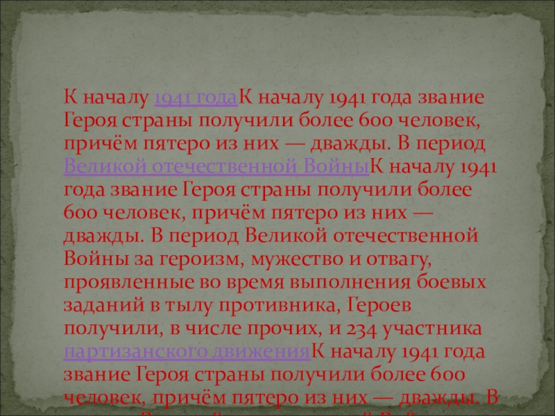 страны получили более 600 человек, причём пятеро из них — дважды. В период Великой отечественной ВойныК началу 1941 года звание Героя страны получили более 600 человек, причём пятеро из них — дважды. В период Великой отечественной Войны за героизм, мужество и отвагу, проявленные во время выполнения боевых заданий в тылу противника, Героев получили, в числе прочих, и 234 участника партизанского движенияК началу 1941 года звание Героя страны получили более 600 человек, причём пятеро из них — дважды. В период Великой отечественной Войны за героизм, мужество и отвагу, проявленные во время выполнения боевых заданий в тылу противника, Героев получили, в числе прочих, и 234 участника партизанского движения, в том числе 24 женщиныК началу 1941 года звание Героя страны получили более 600 человек, причём пятеро из них — дважды. В период Великой отечественной Войны за героизм, мужество и отвагу, проявленные во время выполнения боевых заданий в тылу противника, Героев получили, в числе прочих, и 234 участника партизанского движения, в том числе 24 женщины; дважды награды удостоились легендарные организаторы и руководители освободительных отрядовК началу 1941 года звание Героя страны получили более 600 человек, причём пятеро из них — дважды. В период Великой отечественной Войны за героизм, мужество и отвагу, проявленные во время выполнения боевых заданий в тылу противника, Героев получили, в числе прочих, и 234 участника партизанского движения, в том числе 24 женщины; дважды награды удостоились легендарные организаторы и руководители освободительных отрядов С. А. КовпакК началу 1941 года звание Героя страны получили более 600 человек, причём пятеро из них — дважды. В период Великой отечественной Войны за героизм, мужество и отвагу, проявленные во время выполнения боевых заданий в тылу противника, Героев получили, в числе прочих, и 234 участника партизанского движения, в том числе 24 женщины; дважды награды удостоились легендарные организаторы и руководители освободительных отрядов С. А. Ковпак и А. Ф. Фёдоров.