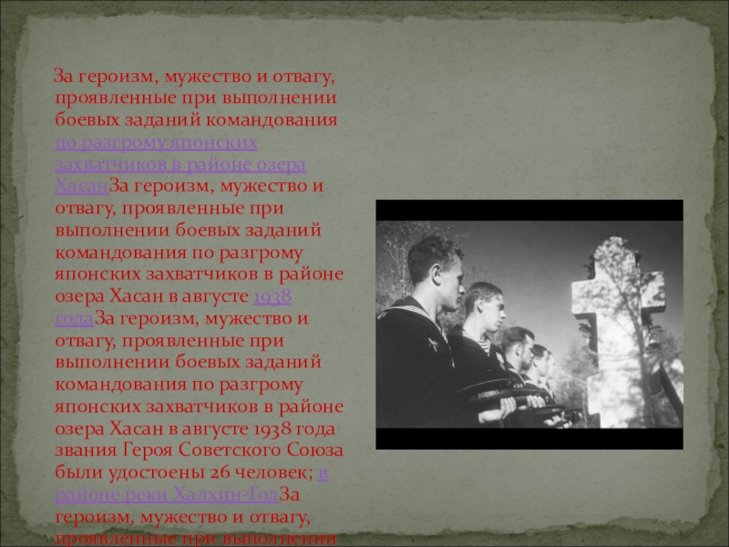 заданий командования по разгрому японских захватчиков в районе озера ХасанЗа героизм, мужество и отвагу, проявленные при выполнении боевых заданий командования по разгрому японских захватчиков в районе озера Хасан в августе 1938 годаЗа героизм, мужество и отвагу, проявленные при выполнении боевых заданий командования по разгрому японских захватчиков в районе озера Хасан в августе 1938 года звания Героя Советского Союза были удостоены 26 человек; в районе реки Халхин-ГолЗа героизм, мужество и отвагу, проявленные при выполнении боевых заданий командования по разгрому японских захватчиков в районе озера Хасан в августе 1938 года звания Героя Советского Союза были удостоены 26 человек; в районе реки Халхин-Гол в апреле — сентябре 1939 годаЗа героизм, мужество и отвагу, проявленные при выполнении боевых заданий командования по разгрому японских захватчиков в районе озера Хасан в августе 1938 года звания Героя Советского Союза были удостоены 26 человек; в районе реки Халхин-Гол в апреле — сентябре 1939 года — 73 человека. За подвиги, совершенные во время советско-финского военного конфликта 1939—1940 гг., Героями Советского Союза стали 412 человек.