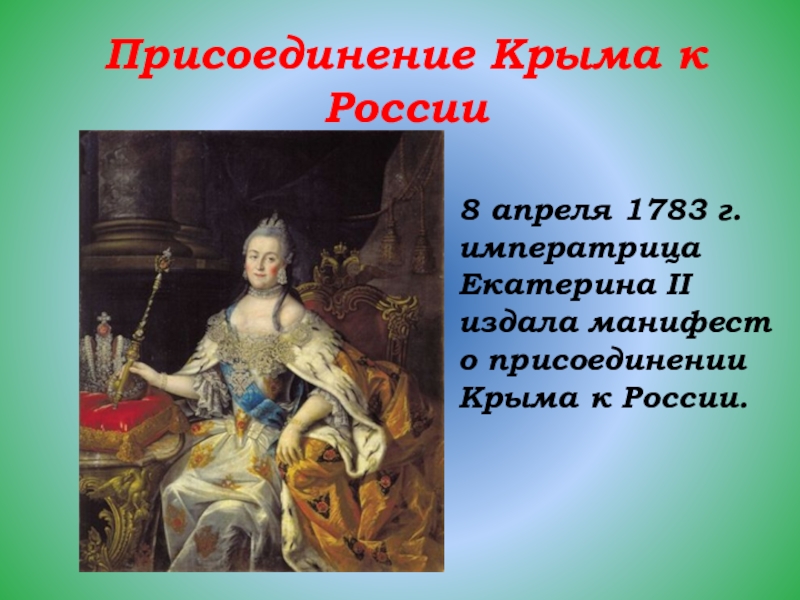 Присоединение Крыма к России8 апреля 1783 г. императрица Екатерина II издала манифест о присоединении Крыма к России.