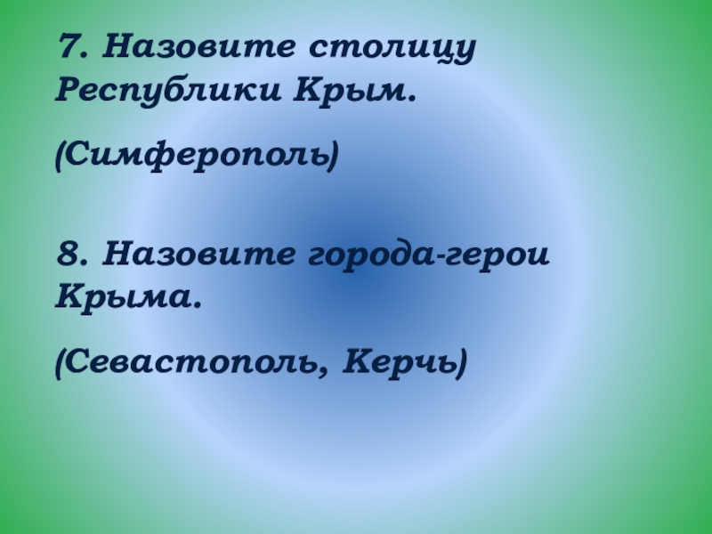 7. Назовите столицу Республики Крым.(Симферополь) 8. Назовите города-герои Крыма.(Севастополь, Керчь)