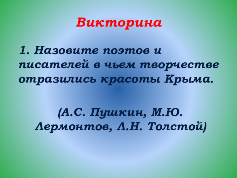 Викторина 1. Назовите поэтов и писателей в чьем творчестве отразились красоты Крыма.(А.С. Пушкин, М.Ю. Лермонтов, Л.Н. Толстой)
