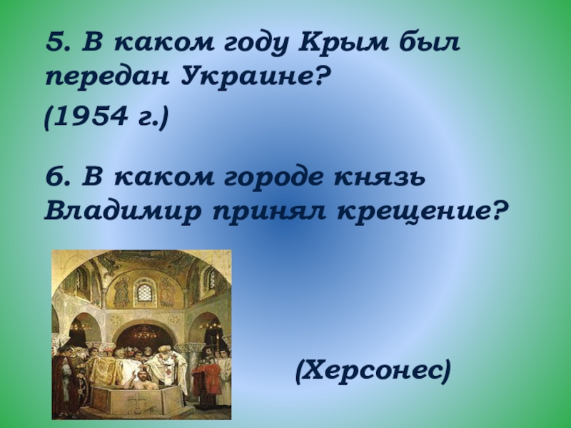 5. В каком году Крым был передан Украине?(1954 г.)6. В каком городе князь Владимир принял крещение?