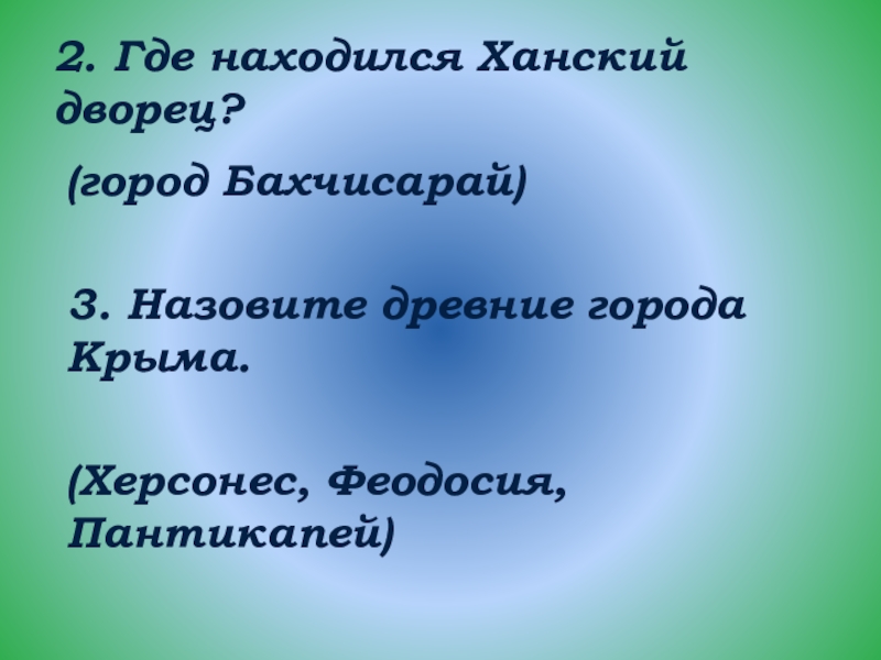 2. Где находился Ханский дворец?(город Бахчисарай)3. Назовите древние города Крыма.(Херсонес, Феодосия, Пантикапей)