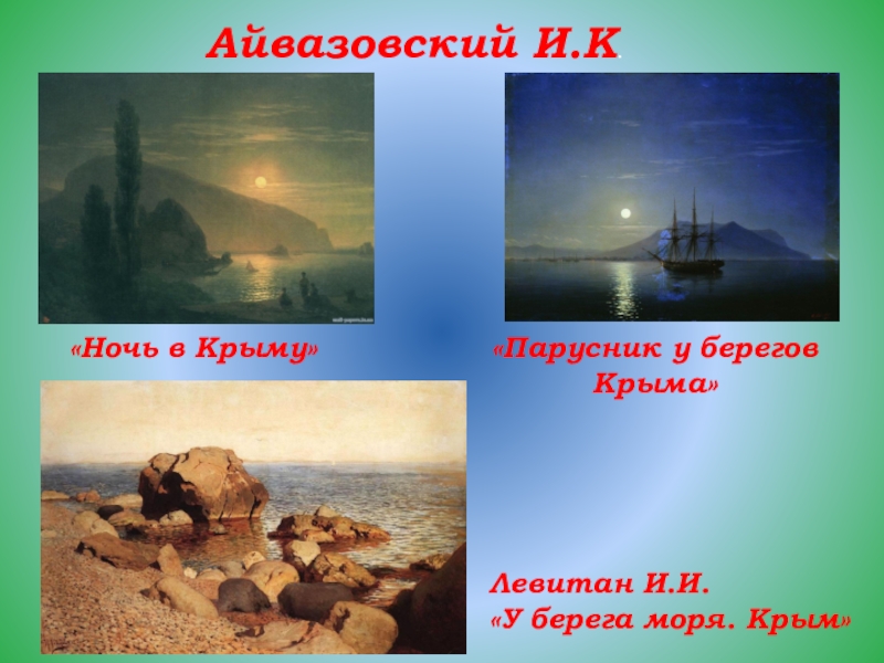 Айвазовский И.К.«Ночь в Крыму»«Парусник у берегов Крыма»Левитан И.И. «У берега моря. Крым»