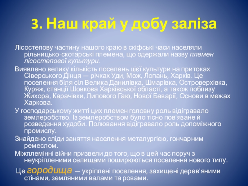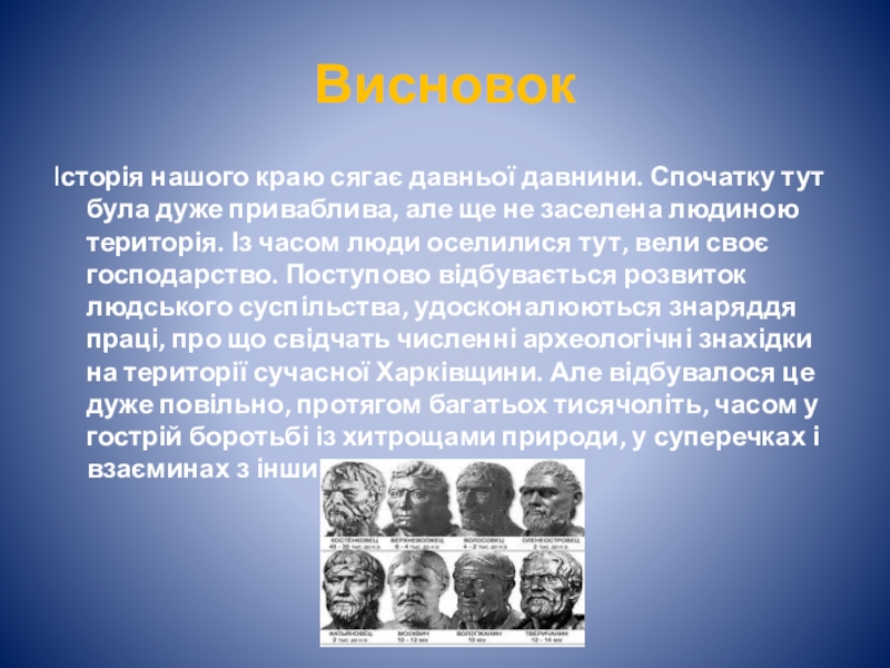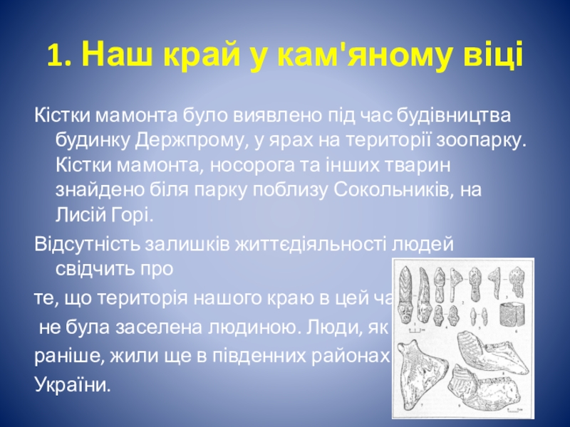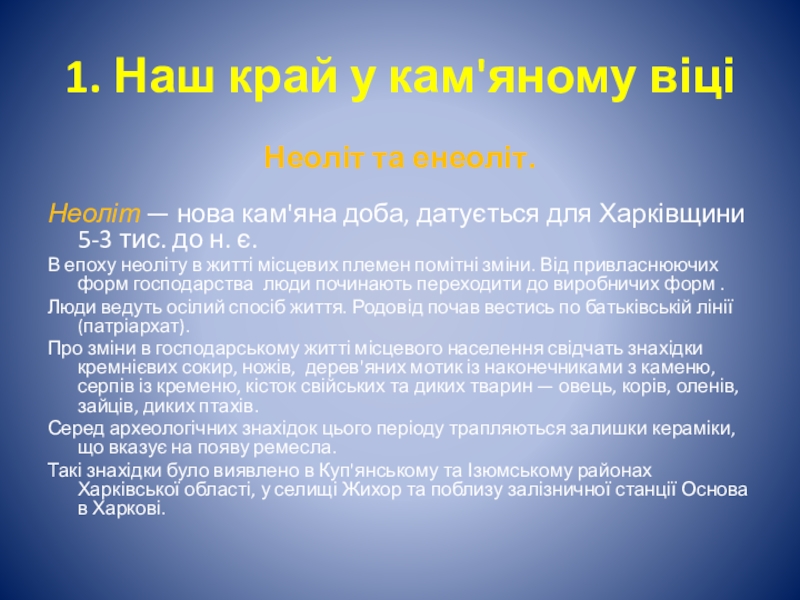 але ще не заселена людиною територія. Із часом люди оселилися тут, вели своє господарство. Поступово відбувається розвиток людського суспільства, удосконалюються знаряддя праці, про що свідчать численні археологічні знахідки на території сучасної Харківщини. Але відбувалося це дуже повільно, протягом багатьох тисячоліть, часом у гострій боротьбі із хитрощами природи, у суперечках і взаєминах з іншими народами.