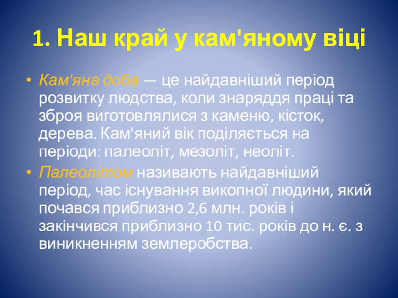 розвитку людства, коли знаряддя праці та зброя виготовлялися з каменю, кісток, дерева. Кам'яний вік поділяється на періоди: палеоліт, мезоліт, неоліт.
