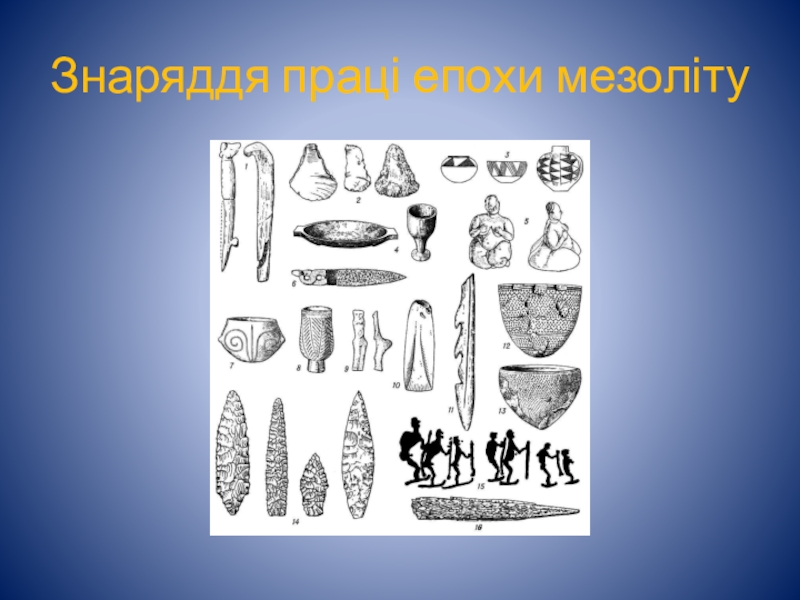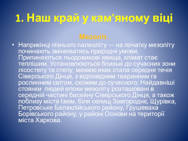 початку мезоліту починають змінюватись природні умови. Припиняються льодовикові явища, клімат стає теплішим. Установлюються близькі до сучасних зони лісостепу та степу, межею яких стала середня течія Сіверського Дінця, з відповідним тваринним га рослинним світом, схожим до сучасного. Найдавніші стоянки людей епохи мезоліту розташовані в середній частині басейну Сіверського Дінця, а також поблизу міста Ізюм, біля селищ Завгороднє, Щурівка, Петровське Балаклійського району, Грушеваха Борівського району, у районі Основи на території міста Харкова.