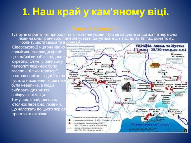 та кліматичні умови. Про це свідчать сліди життя первісної людини кінця раннього палеоліту, який датується від 3 тис. до 35-33 тис. років тому. Поблизу міста Ізюма та в пониззі