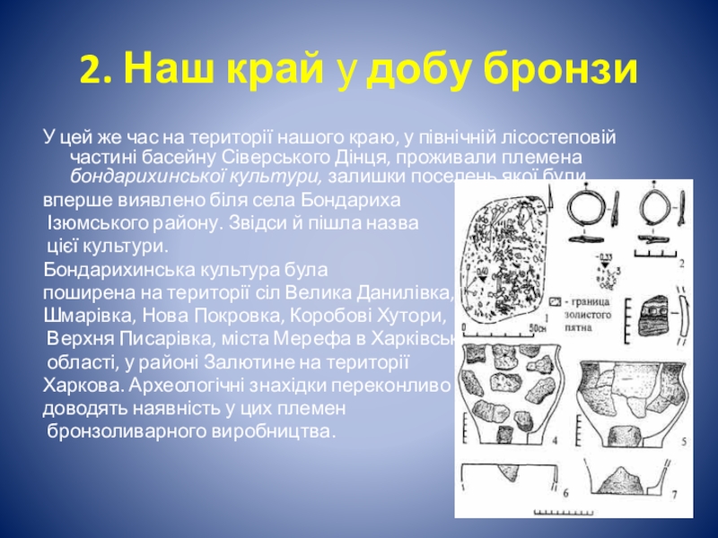 нашого краю, у північній лісостеповій частині басейну Сіверського Дінця, проживали племена бондарихинської культури, залишки поселень якої були