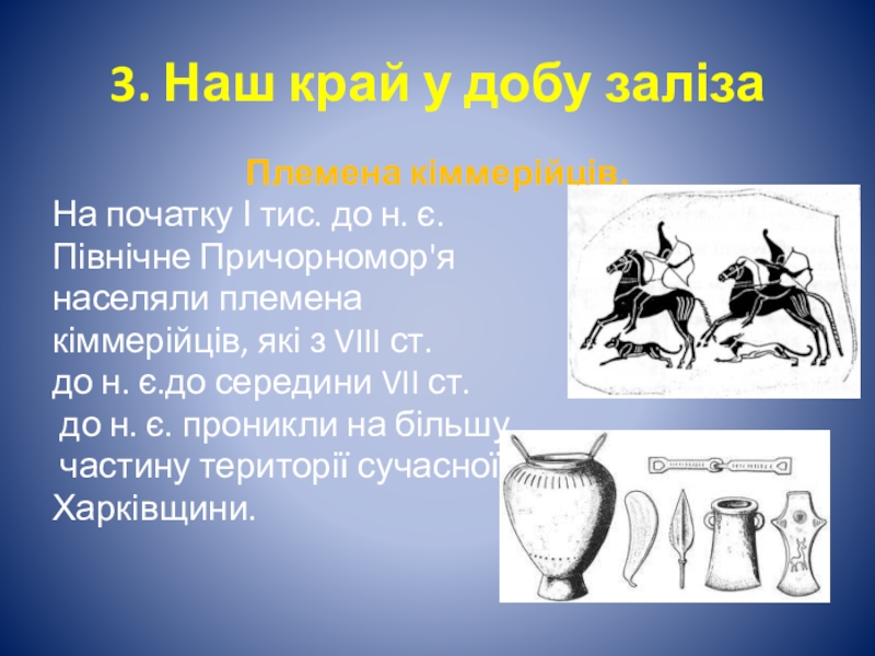 ст. до н. є. кіммерійців витісняють кочові племена скіфів, які займають степові території в Північному Причорномор'ї. Одна з груп скотарських скіфських племен, які займали панівне становище, володіла великою територією, що охоплювала степову частину басейну Сіверського Дінця. Скіфи утворили Скіфське царство, до складу якого входила й південна частина сучасної Харківщини.