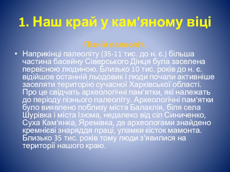 до н. є.) більша частина басейну Сіверського Дінця була заселена первісною людиною. Близько 10 тис. років до н. є. відійшов останній льодовик і люди почали активніше заселяти територію сучасної Харківської області. Про це свідчать археологічні пам'ятки, які належать до періоду пізнього палеоліту. Археологічні пам'ятки було виявлено поблизу міста Балаклія, біля села Шурівка і міста Ізюма, недалеко від сіл Синиченко, Суха Кам'янка, Яремівка, де археологами знайдено кремнієві знаряддя праці, уламки кісток мамонта. Близько 35 тис. років тому люди з'явилися на території нашого краю.