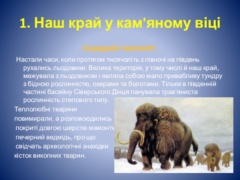 тисячоліть з півночі на південь рухались льодовики. Велика територія, у тому числі й наш край, межувала з льодовиком і являла собою мало привабливу тундру з бідною рослинністю, озерами та болотами. Тільки в південній частині басейну Сіверського Дінця панувала трав'яниста рослинність степового типу.
